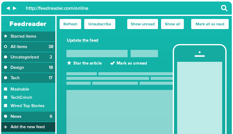 After all the hard work we've done over the recent months, we are proud to represent Feedreader Online - a modern “reincarnation” of Feedreader! Renewed, dynamic and neat: it has all the features you need for easy and convenient feed reading.